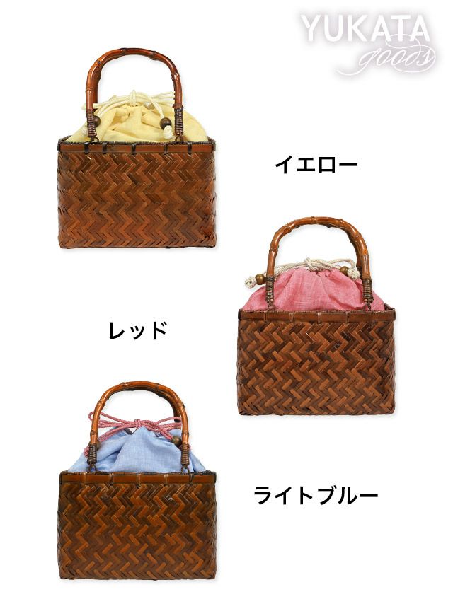 3. [浴衣小物] 無地巾着付きスクエア竹編みかごバッグ