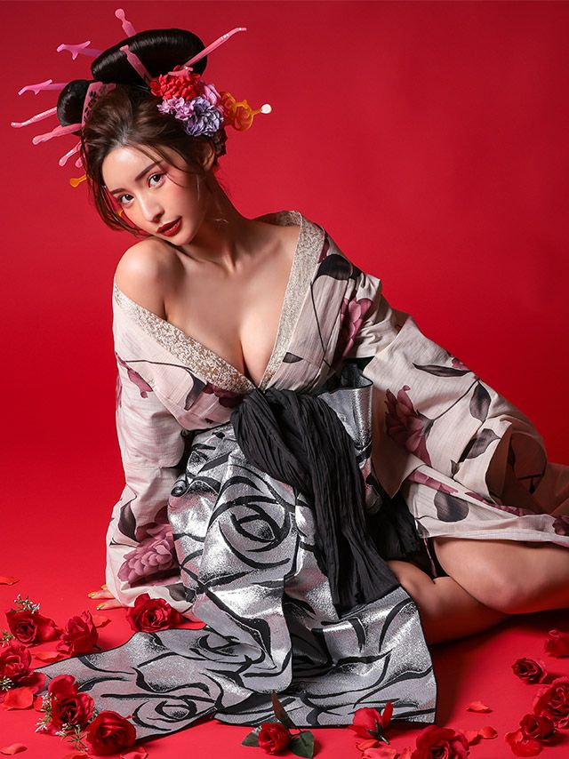 花魁 ベージュ地×アンティークフラワー 2way おいらん浴衣5点セットのイメージ画像1