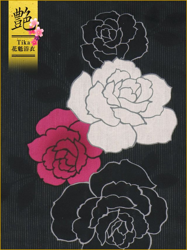 花魁 黒地×片身変わり薔薇の花2way おいらん浴衣5点セットの生地アップ画像