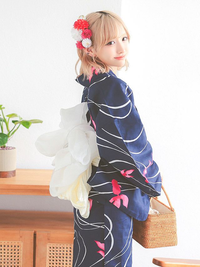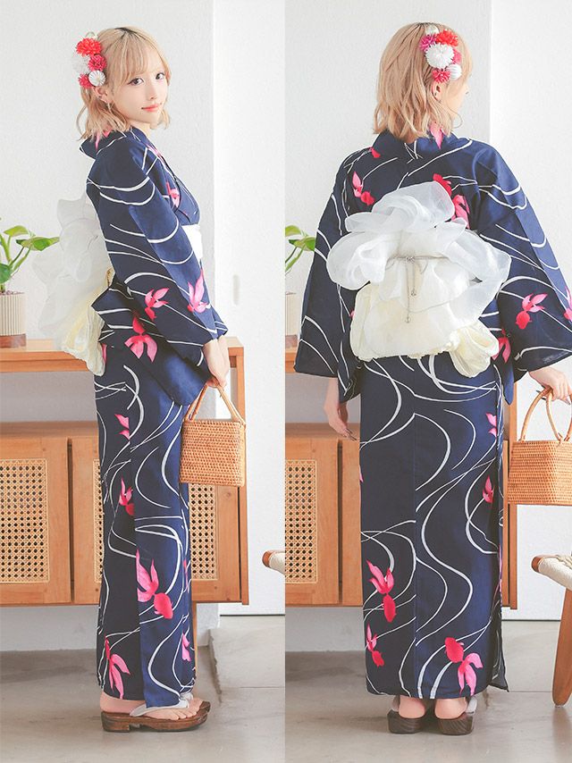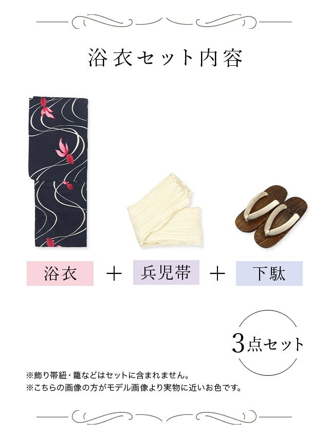 3. [浴衣] レトロ 紺地 流水金魚 3点セット まやりん着用 (ゆかた・兵児帯・下駄)