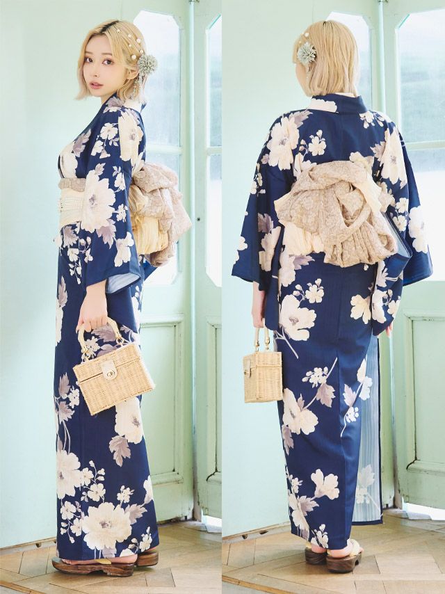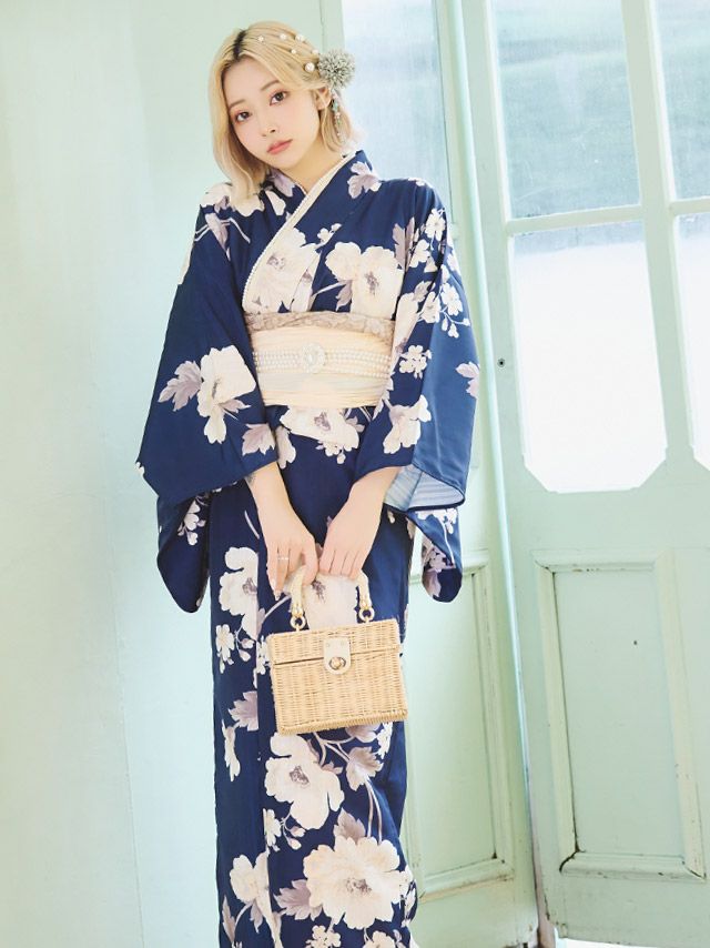華やかアンティークフラワー ゆかた3点セットのセット内容 ダークネイビー/浦西ひかる着用