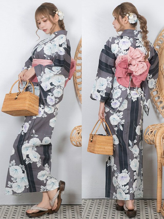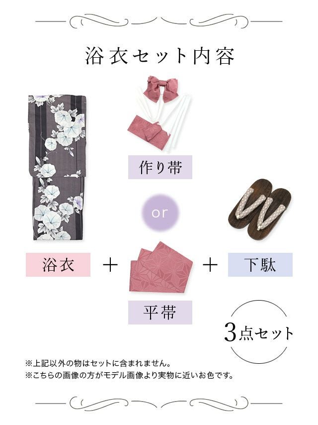 多くの浴衣は「浴衣+帯」または「浴衣+帯+下駄」の3点セットになっています。商品ごとにセット内容が異なるため、各ページの詳細をご確認ください。