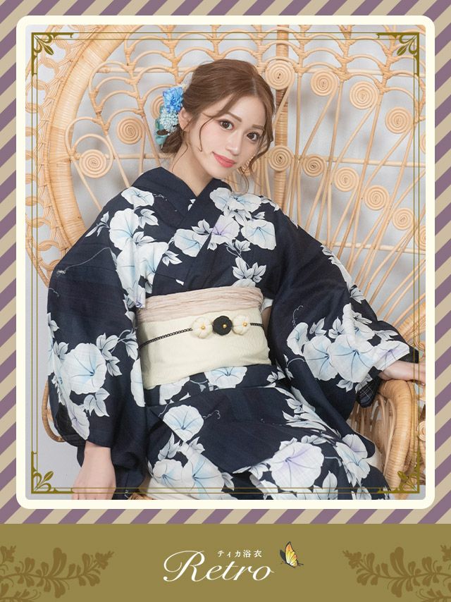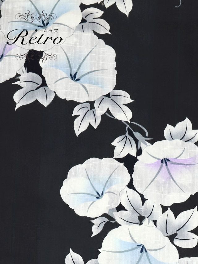 3. [浴衣 選べる帯] レトロ 紺地に華やか朝顔 3点セット (ゆかた・平帯or作り帯・下駄)