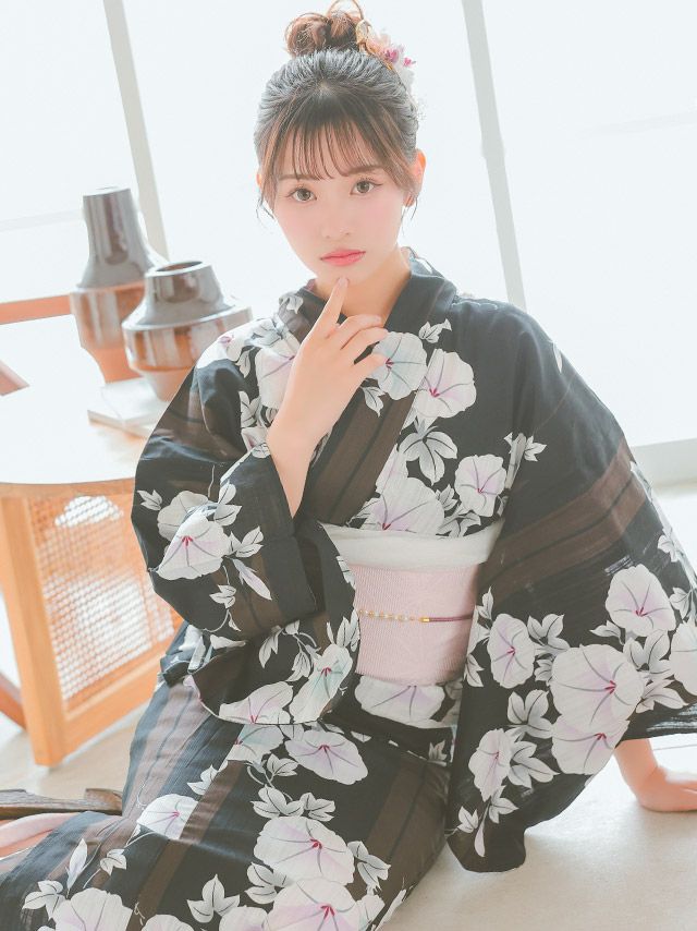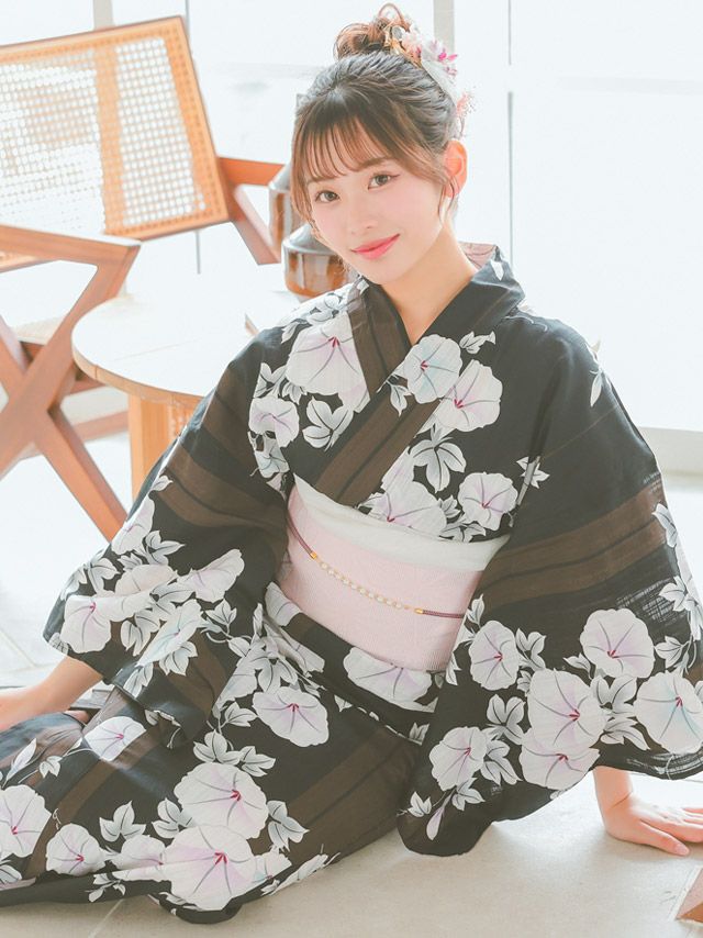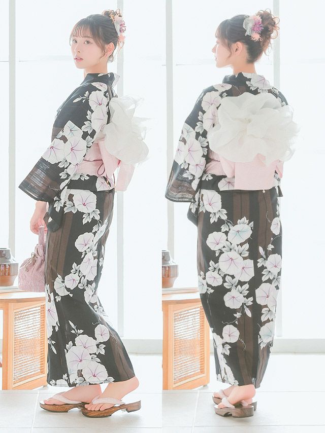 黒地にマルチストライプ×朝顔ゆかた3点セットのイメージ画像2