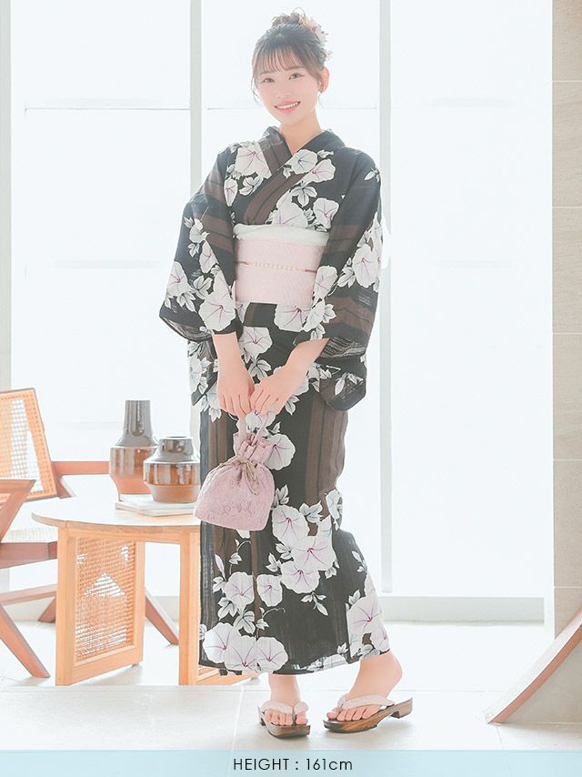 5. [浴衣 選べる帯] レトロ 黒地 マルチストライプ 朝顔 3点セット (ゆかた・平帯or作り帯・下駄)