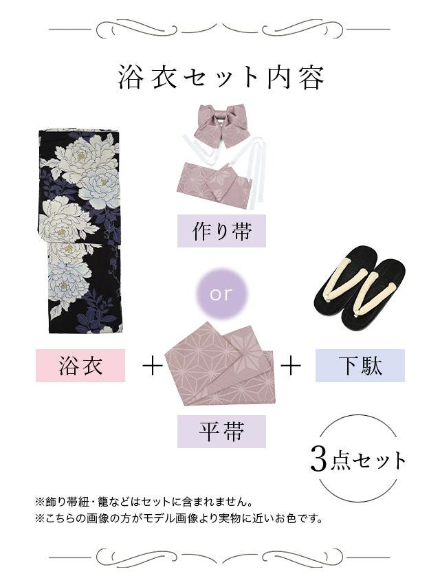 3. [浴衣 選べる帯] 黒地に大輪白牡丹 3点セット (ゆかた・平帯or作り帯・下駄)