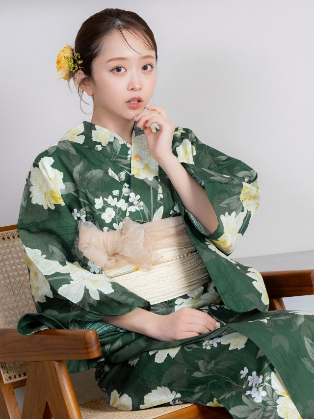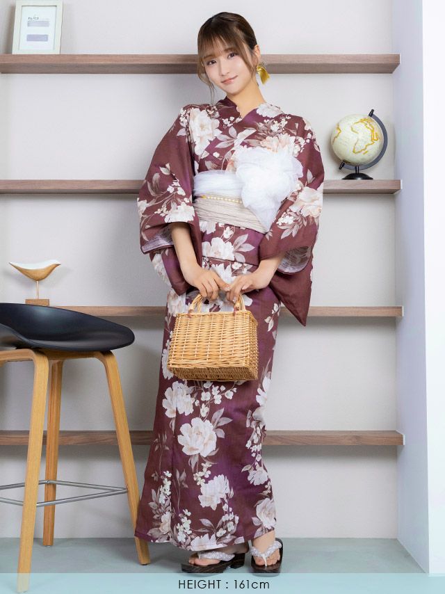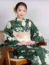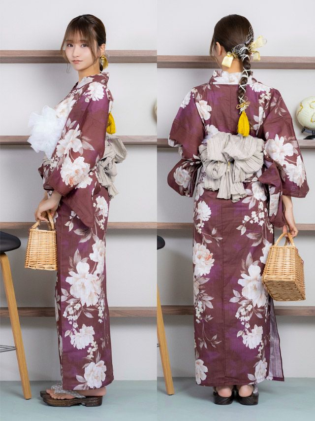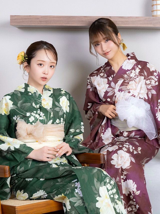 グリーン(みりちゃむ着用) レトロ アンティーク 牡丹 ゆかた3点セットのセット内容 ワイン(森脇梨々夏着用) レトロ アンティーク 牡丹 ゆかた3点セットのセット内容