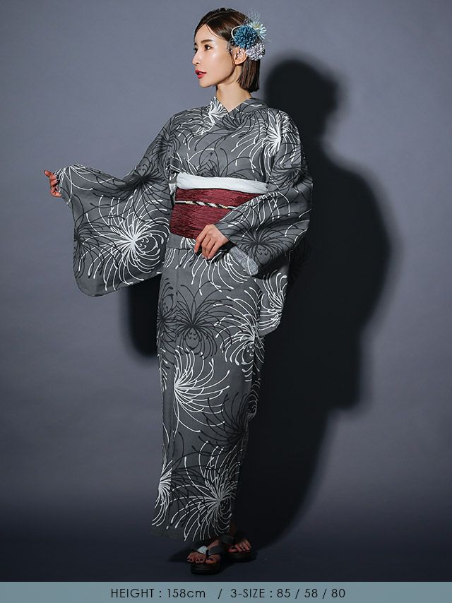 粋 グレー地×モノトーン糸菊ゆかた3点セットのサイズ表