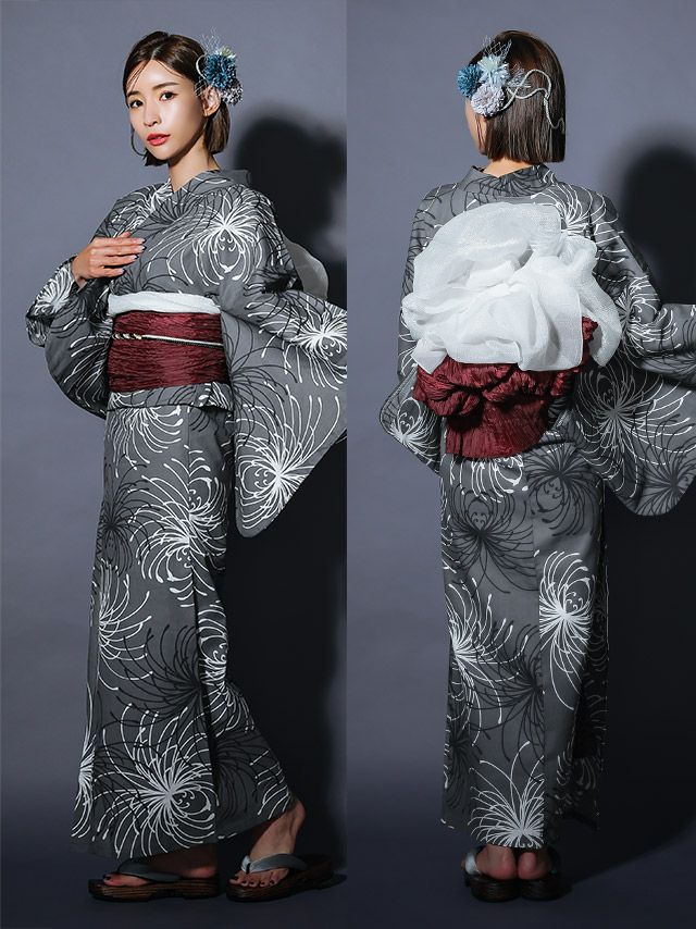 粋 グレー地×モノトーン糸菊ゆかた3点セット内容