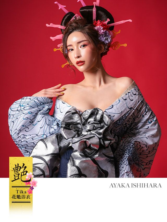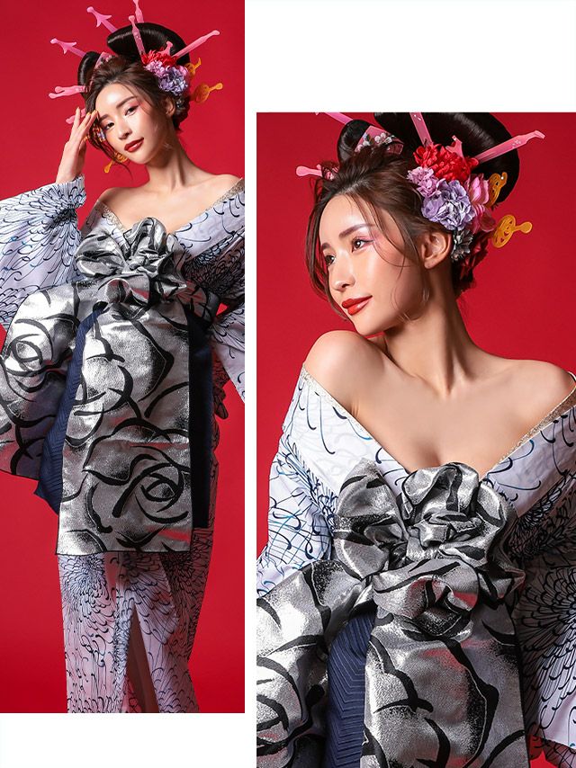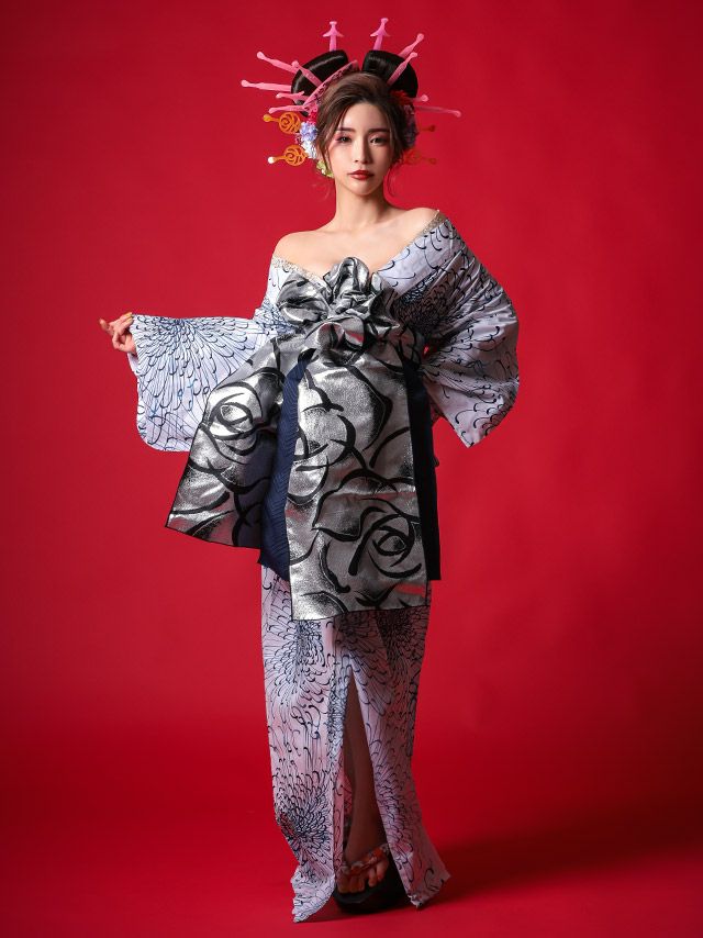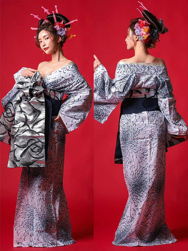 花魁 白地×大輪乱菊2way おいらん浴衣5点セットの2wayの例1画像