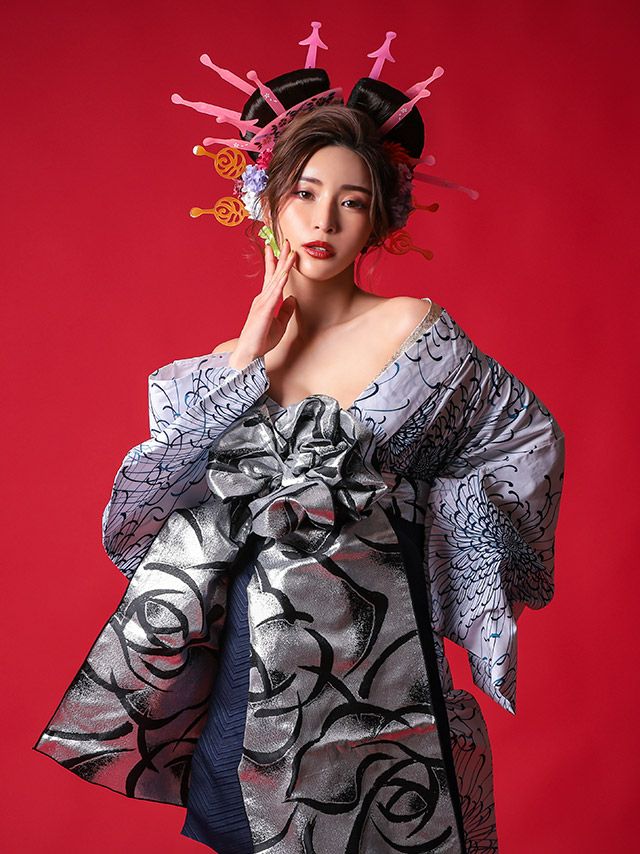 花魁 白地×大輪乱菊2way おいらん浴衣5点セットの2wayの例2画像