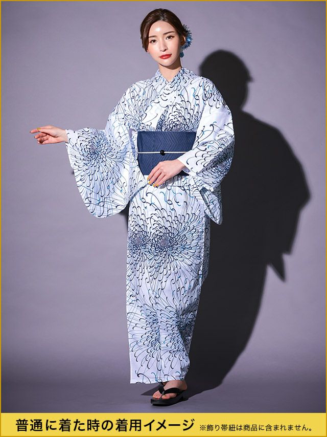 知的で華のある大人女性を演出♪ [花魁浴衣] 桜まつり 2way 白地×大輪乱菊 5点セット (ゆかた・下駄・兵児帯・飾り兵児帯・肌襦袢)
