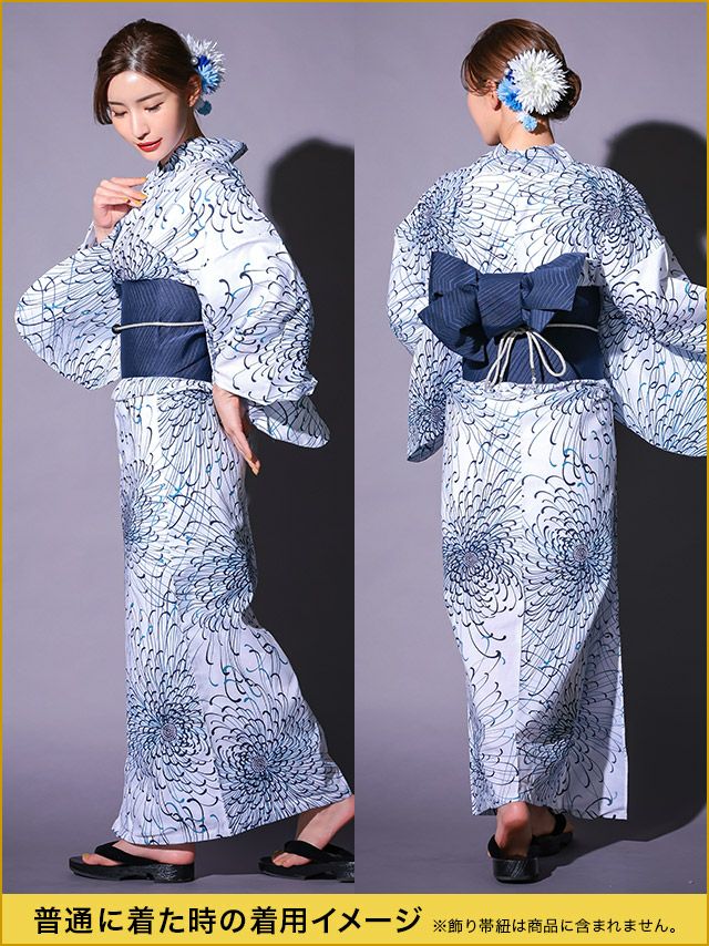 3. [花魁浴衣] 桜まつり 2way 白地×大輪乱菊 5点セット (ゆかた・下駄・兵児帯・飾り兵児帯・肌襦袢)