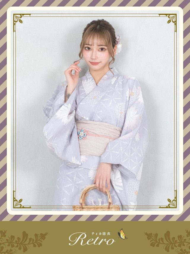 3. SALE [浴衣] レトロ グレー地にとりどり菊 3点セット (ゆかた・兵児帯・下駄)