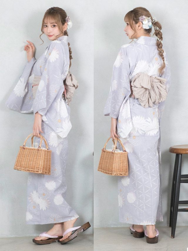 グレー地にとりどり菊 ゆかた3点セットの全身フロント画像