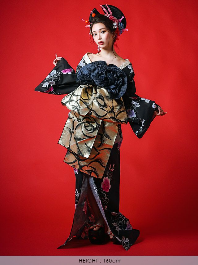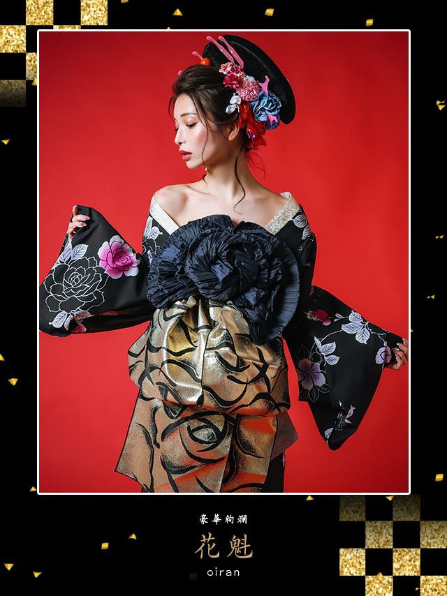 花魁 黒地×縁取りグラデーションローズ2way おいらん浴衣5点セットの2wayの例1画像