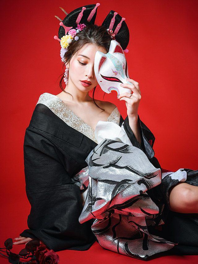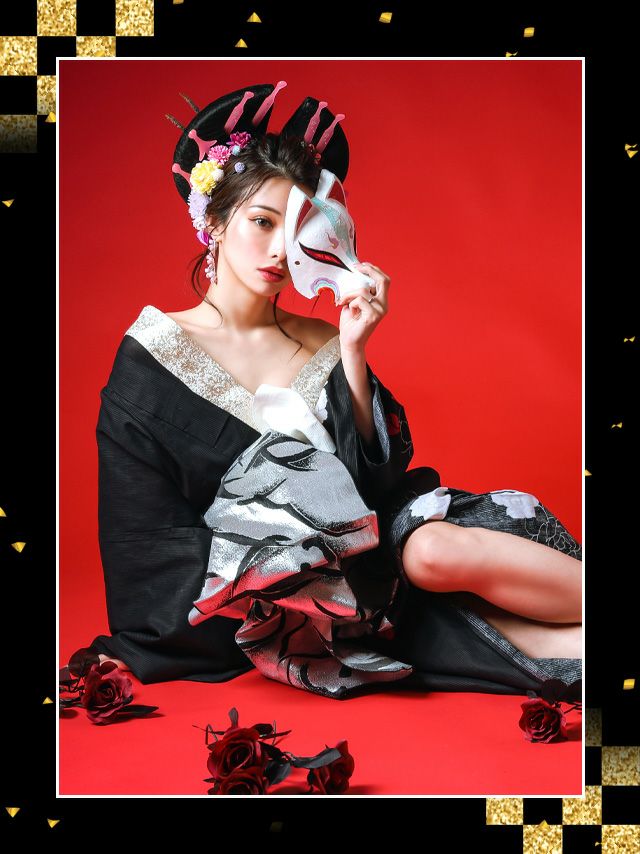 花魁 黒地×片身変わり薔薇の花2way おいらん浴衣5点セットの2wayの例1画像
