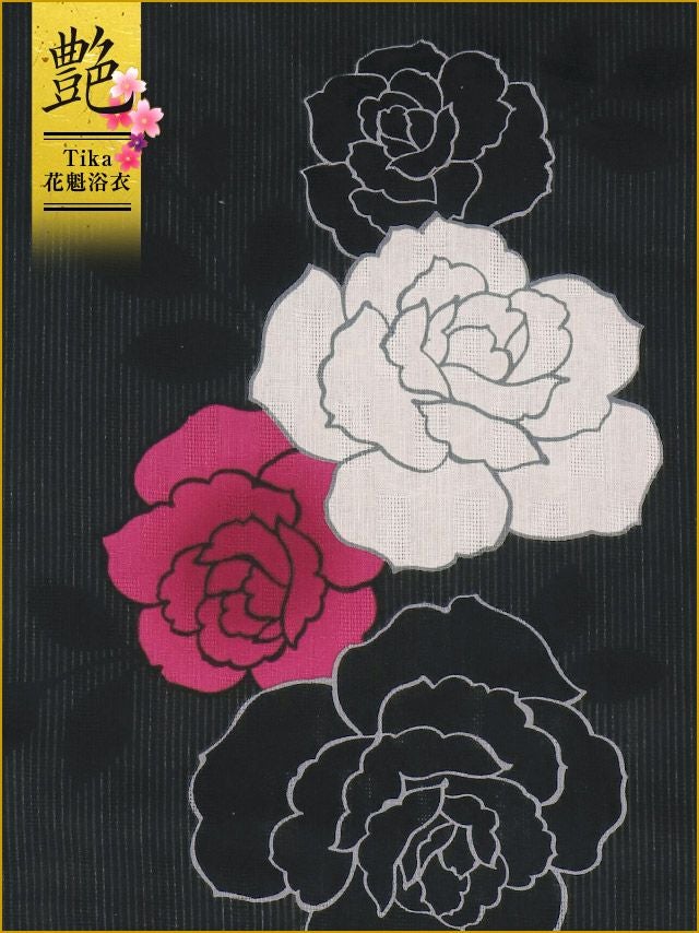3. [花魁浴衣] 桜まつり 2way 黒地×片身変わり薔薇の花 5点セット (ゆかた・下駄・兵児帯・飾り兵児帯・肌襦袢)
