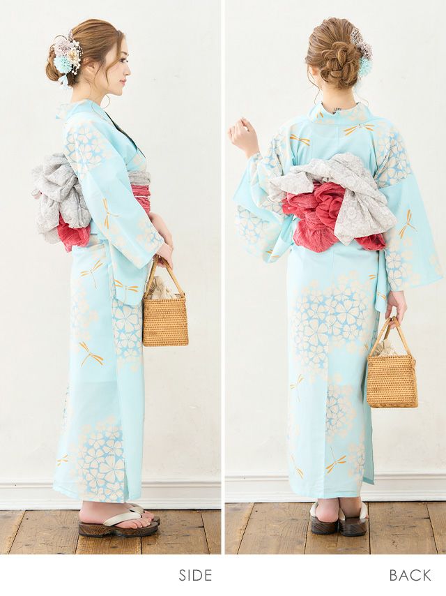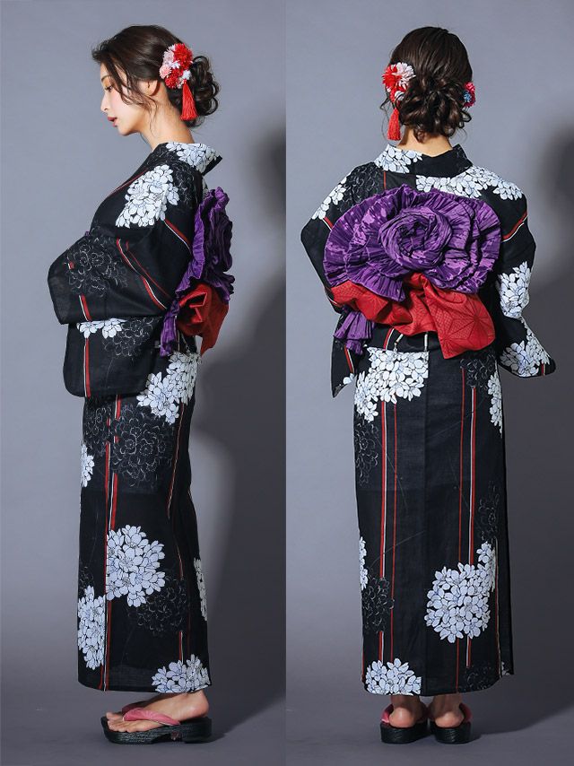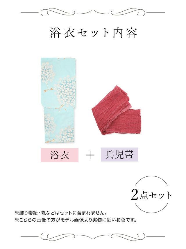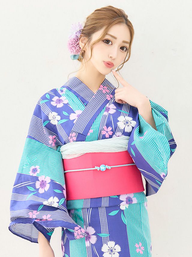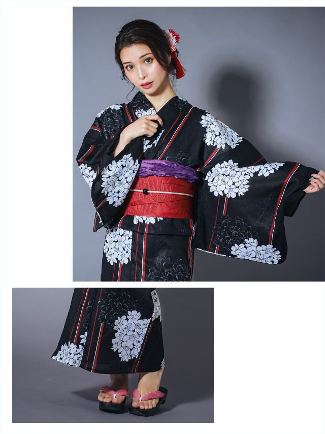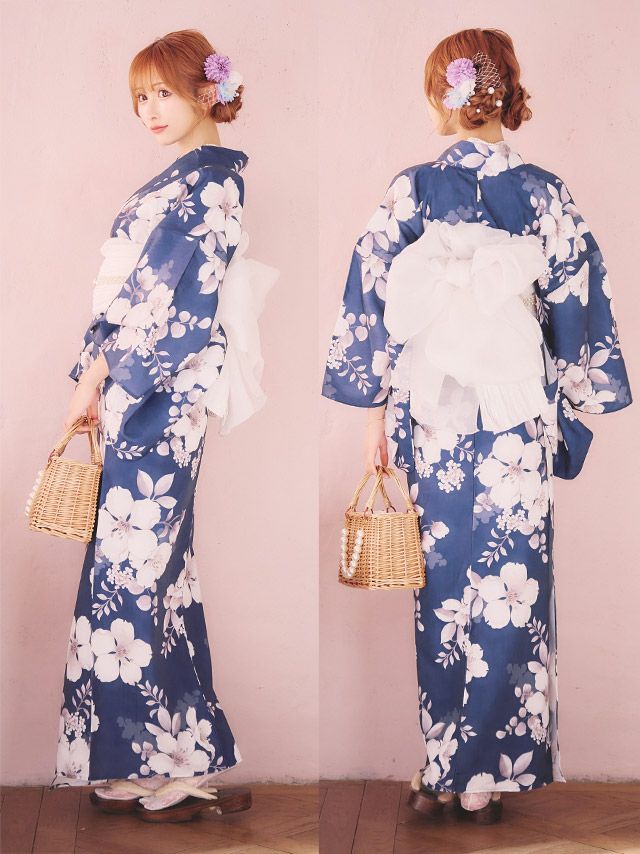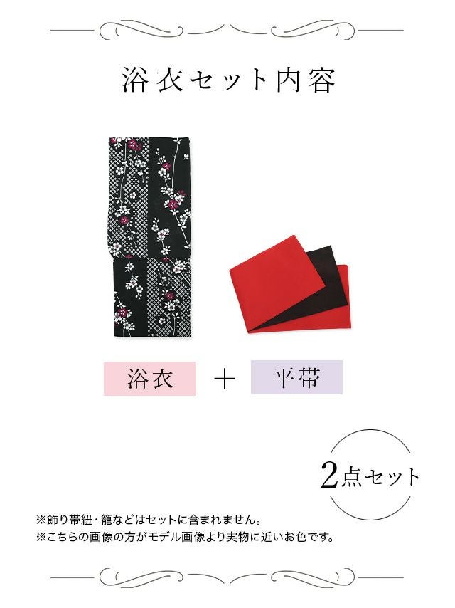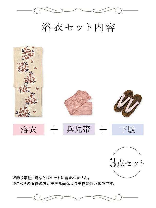 多くの浴衣は「浴衣+帯」または「浴衣+帯+下駄」の3点セットになっています。商品ごとにセット内容が異なるため、各ページの詳細をご確認ください。