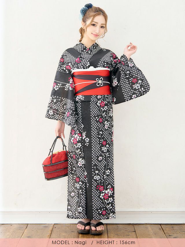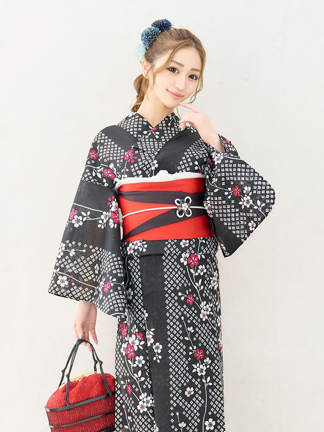 3. [浴衣] プチプラ 安い 黒地×しだれ桜 2点セット (ゆかた・平帯)