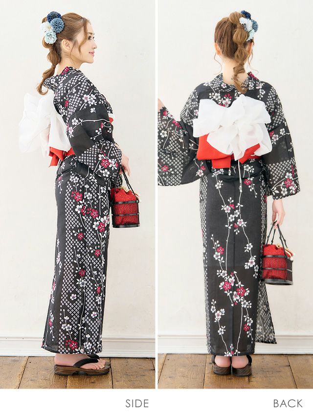 レトロ 黒地×しだれ桜セットの全身サイドバック画像
