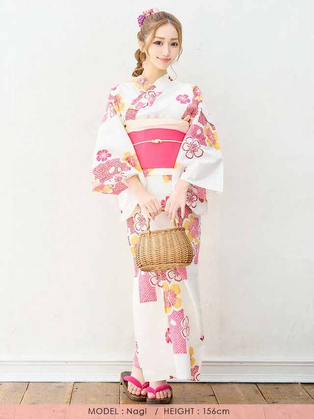 3. [浴衣] プチプラ 安い 白地×ピンク桜 3点セット (ゆかた・作り帯・下駄)