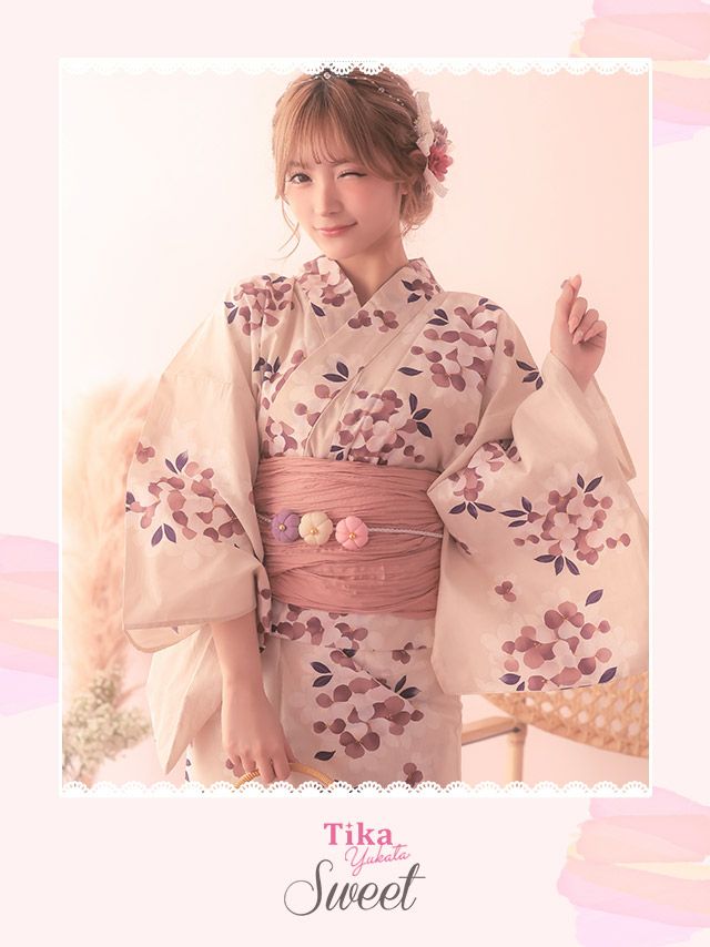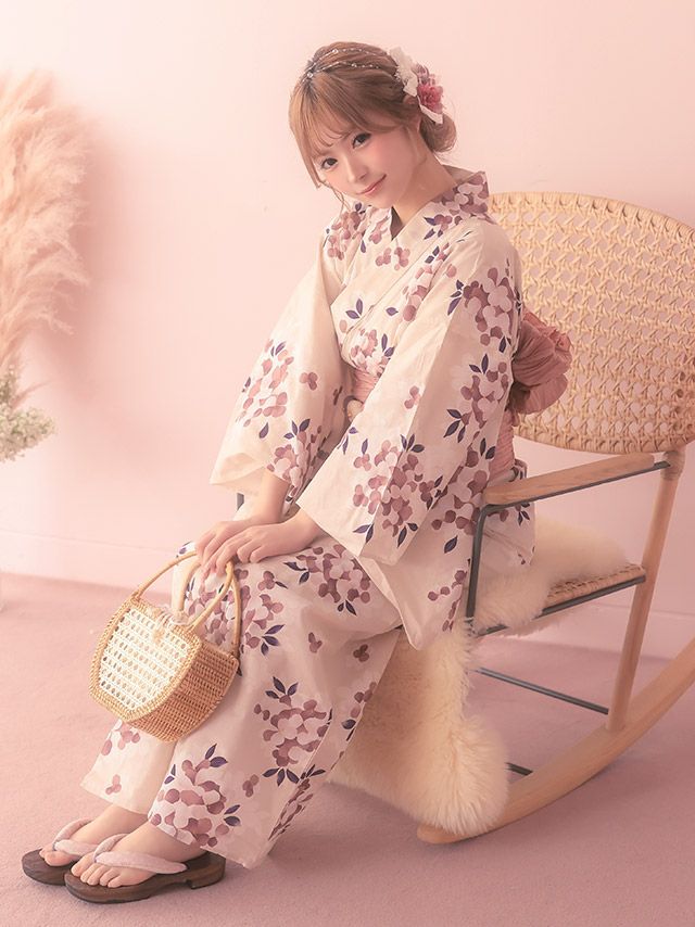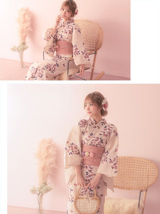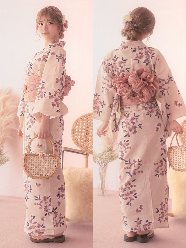 クリーム地に山桜 ゆかた3点セットの全身フロント画像