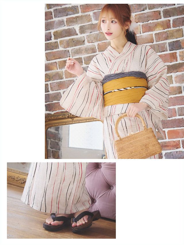 5. [浴衣] レトロ 生成地×2色よろけ縞 2点セット (ゆかた・兵児帯)