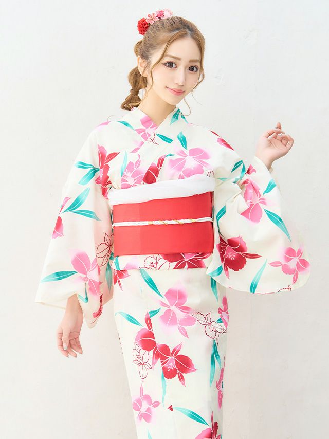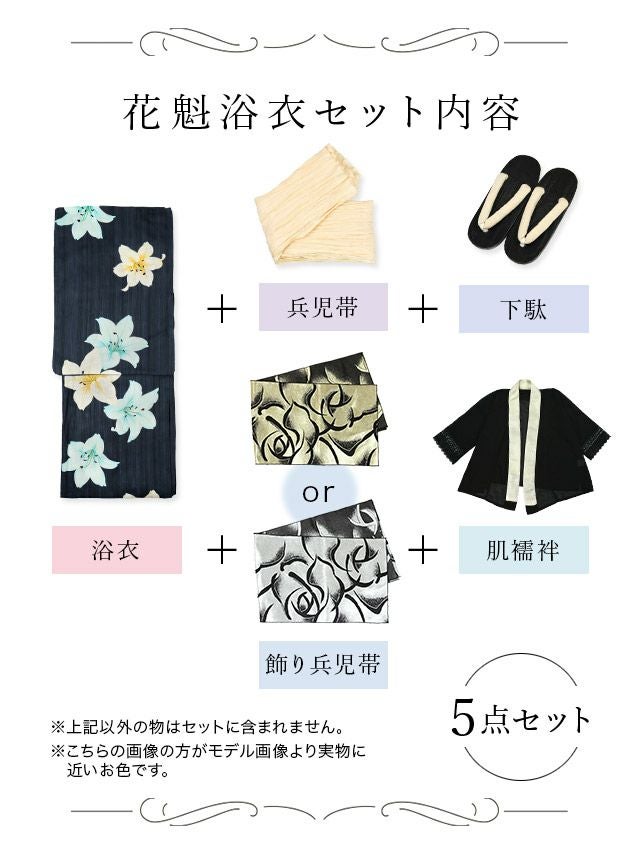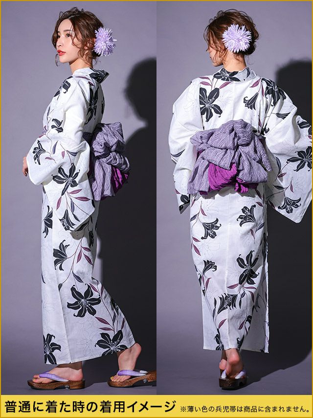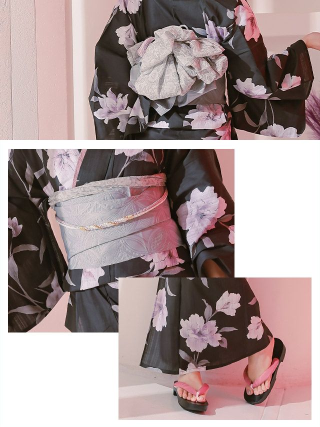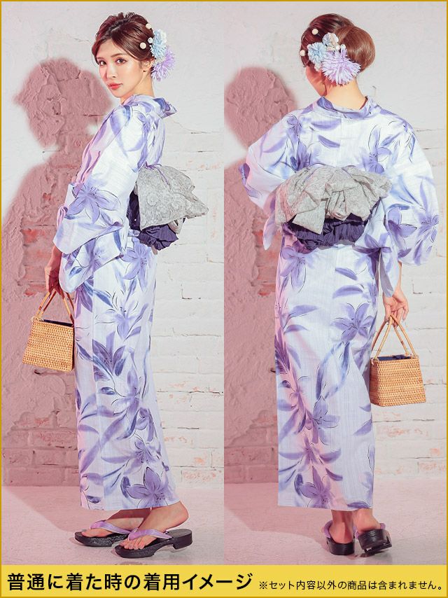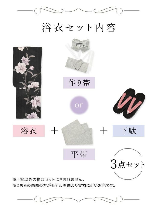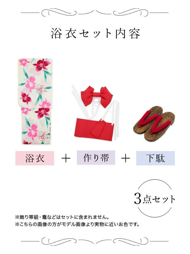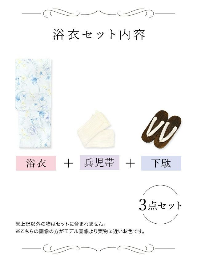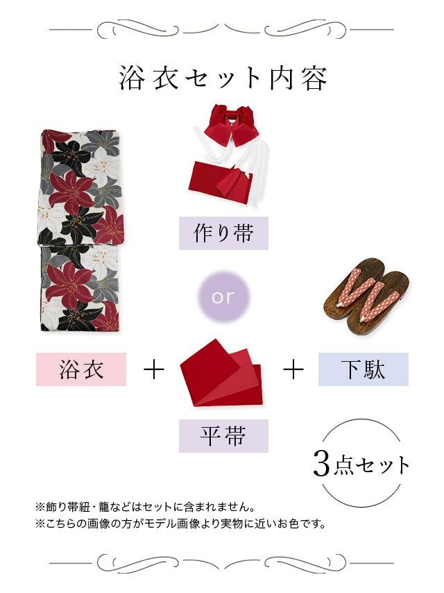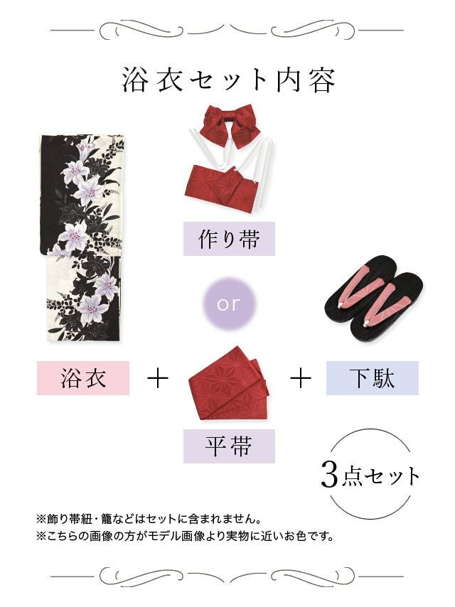 多くの浴衣は「浴衣+帯」または「浴衣+帯+下駄」の3点セットになっています。商品ごとにセット内容が異なるため、各ページの詳細をご確認ください。