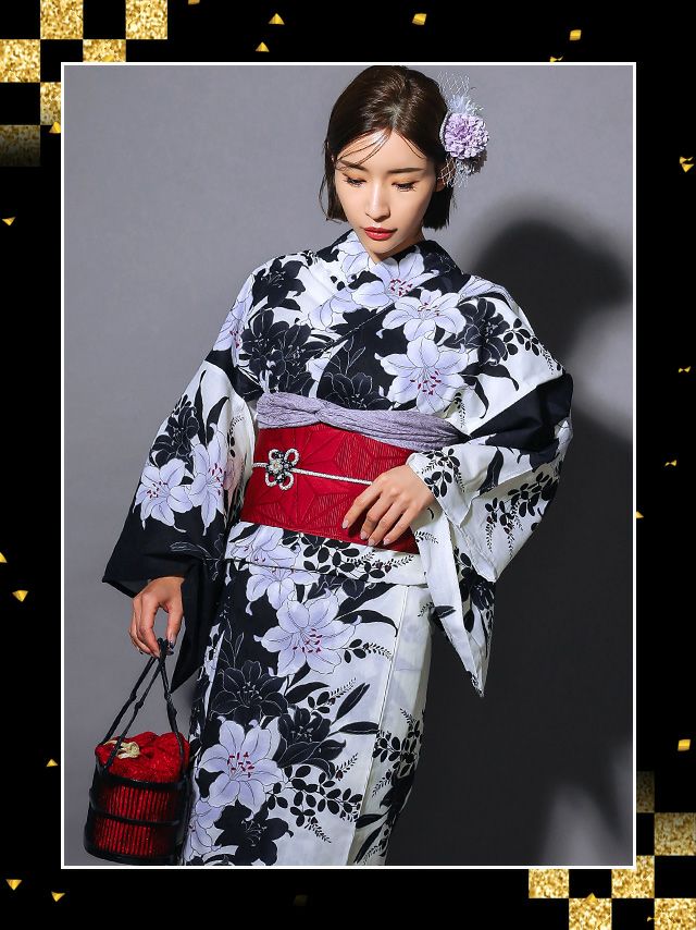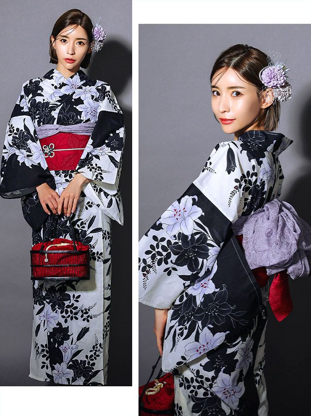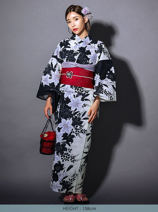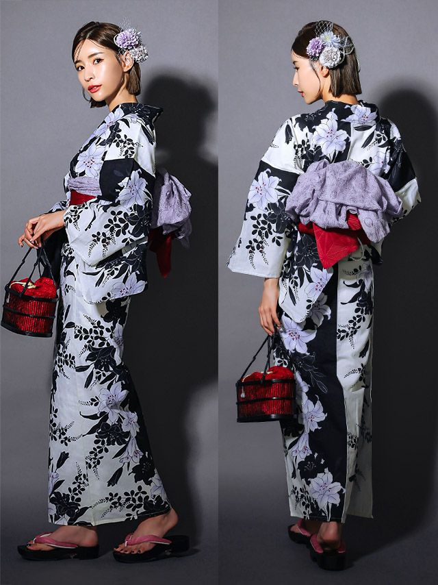5. [浴衣 選べる帯] 粋 モノトーン萩百合 3点セット (ゆかた・平帯or作り帯・下駄)