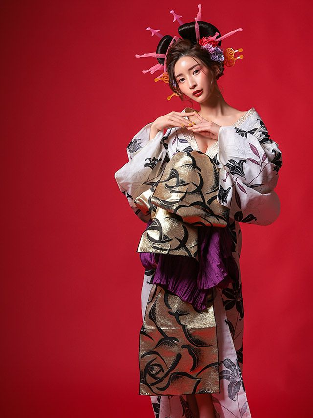 花魁 白地×モノトーン百合 2way おいらん浴衣5点セットの2wayの例1画像