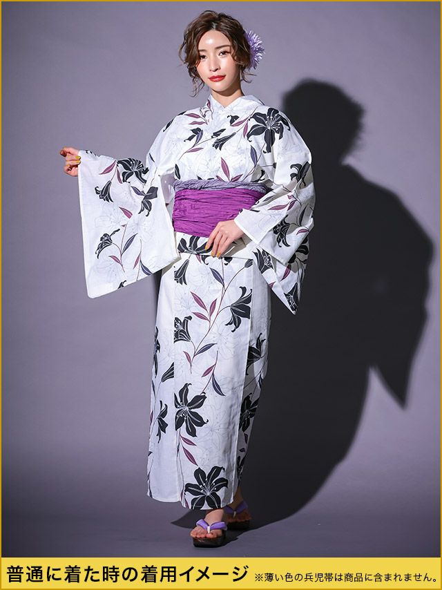 4. [花魁浴衣] 桜まつり 2way 白地×モノトーン百合 5点セット (ゆかた・下駄・兵児帯・飾り兵児帯・肌襦袢)
