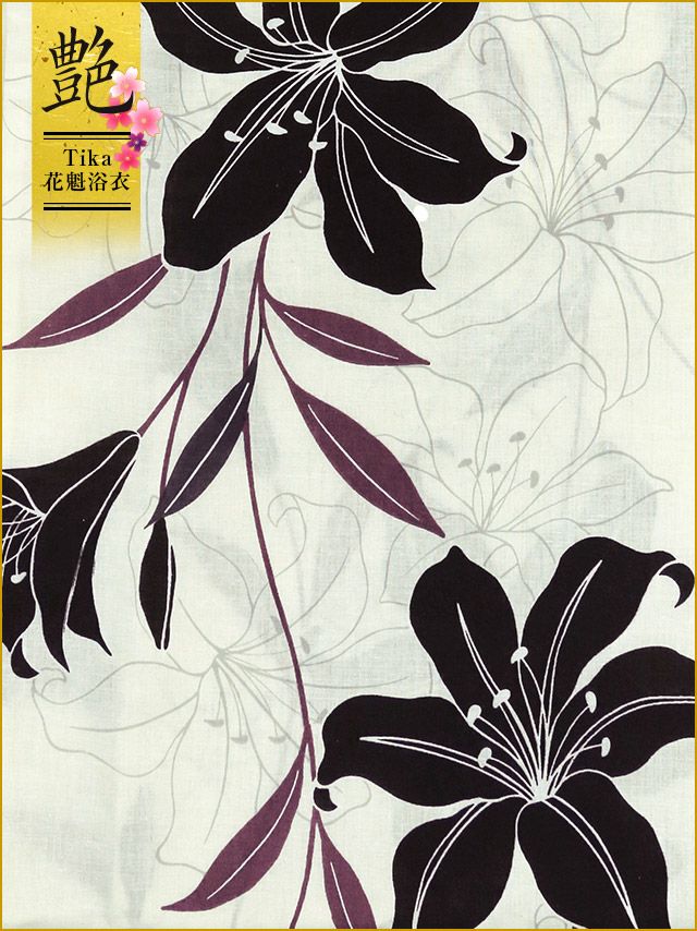 花魁 白地×モノトーン百合 2way おいらん浴衣5点セットの生地アップ画像