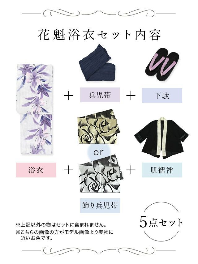 花魁 白地×パープル水彩百合2way おいらん浴衣5点セットのセット内容