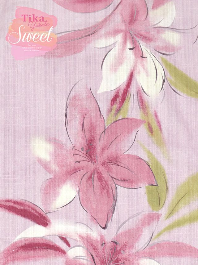 スウィート ピンク地に水彩百合の花 ゆかた3点セットの生地アップ画像