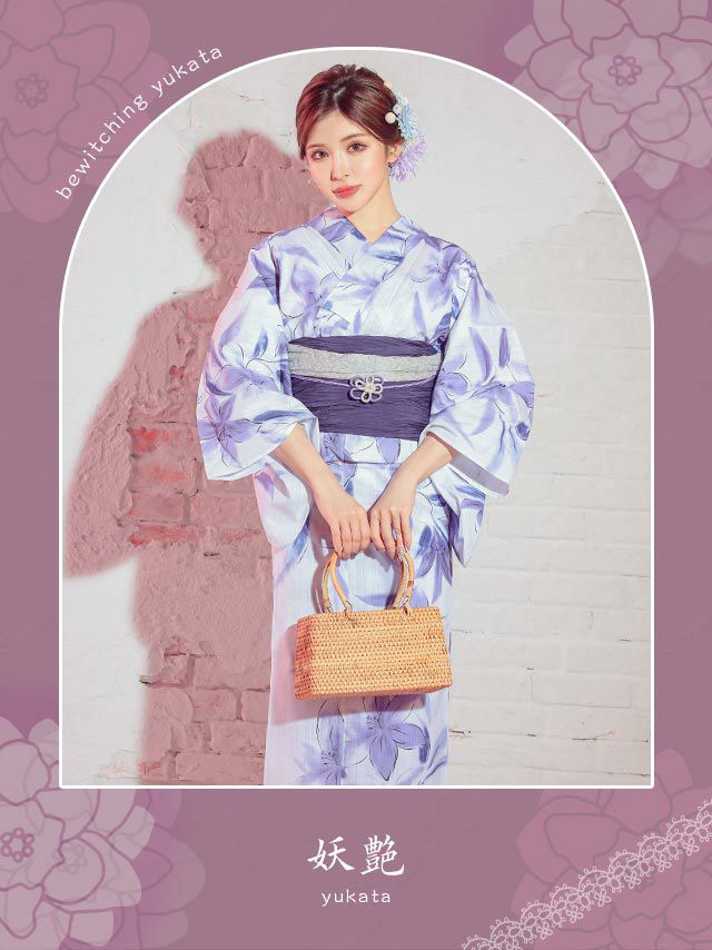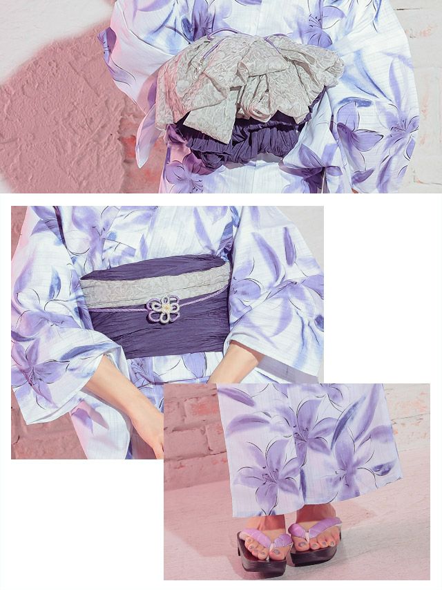 妖艶 白地×水彩紫の百合の花 ゆかた3点セット内容