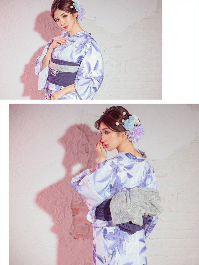 妖艶 白地×水彩紫の百合の花 ゆかた3点セットのイメージ画像3
