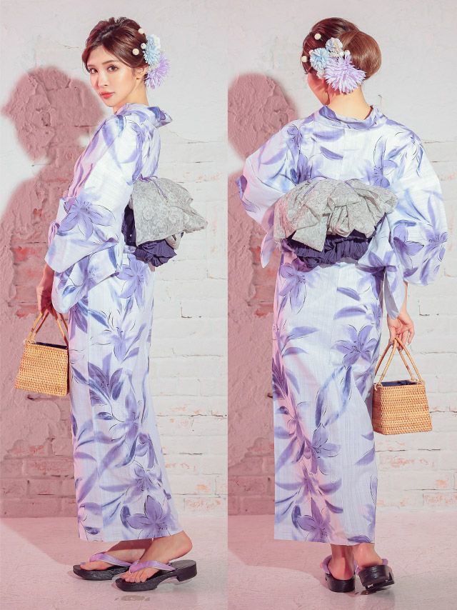 3. [浴衣] 妖艶 白地×水彩紫の百合の花 3点セット (ゆかた・兵児帯・下駄)