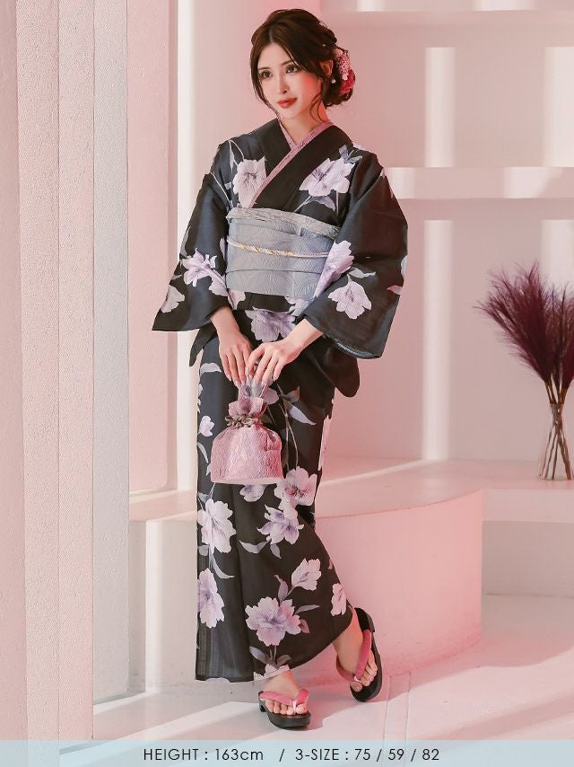 3. [浴衣 選べる帯] 妖艶 黒地×水彩百合 3点セット (ゆかた・平帯or作り帯・下駄)