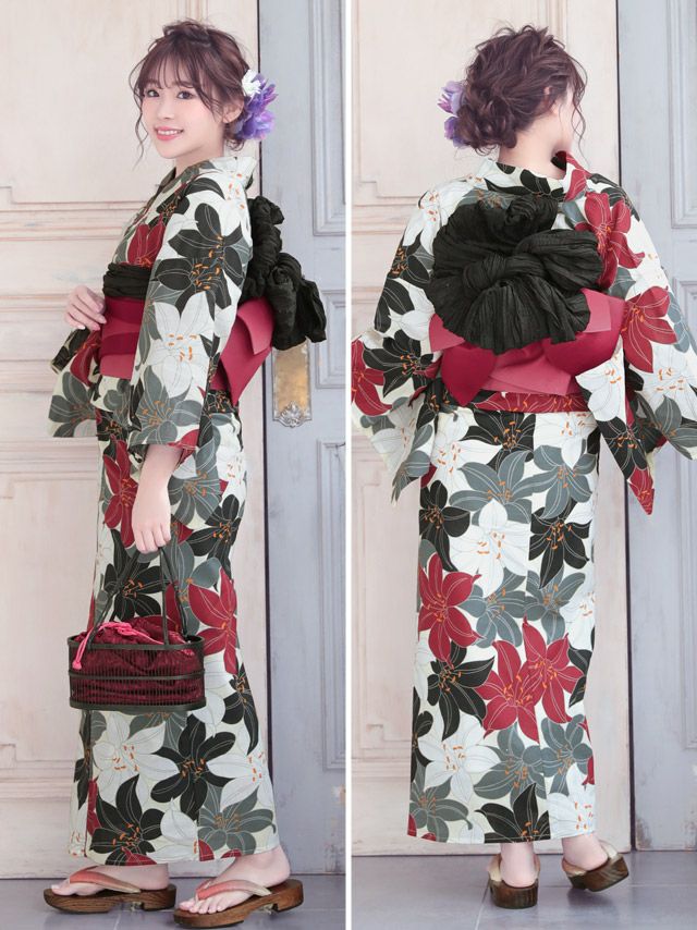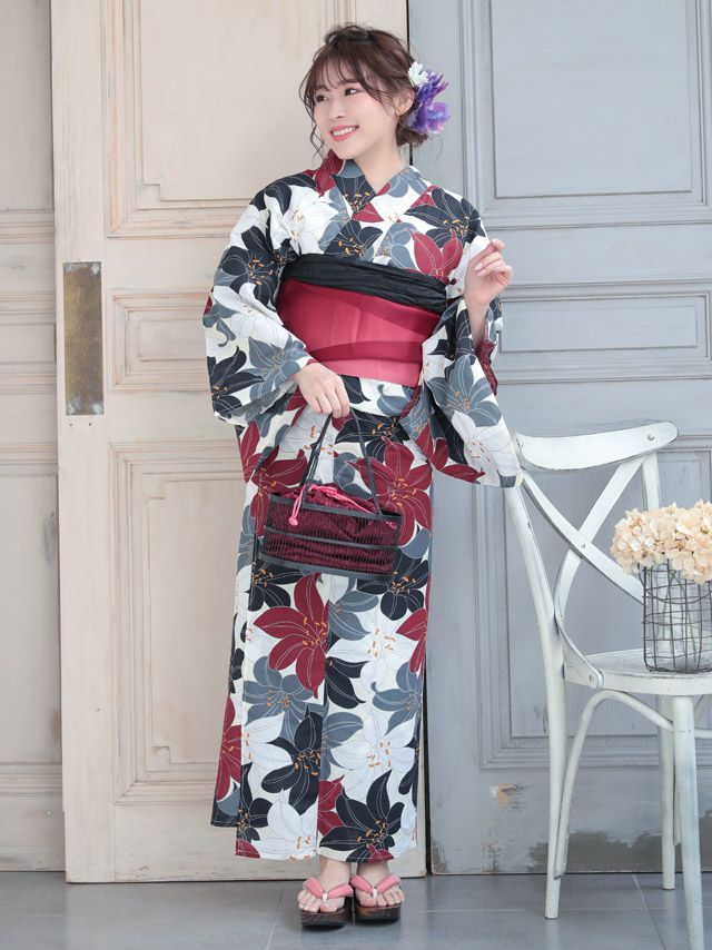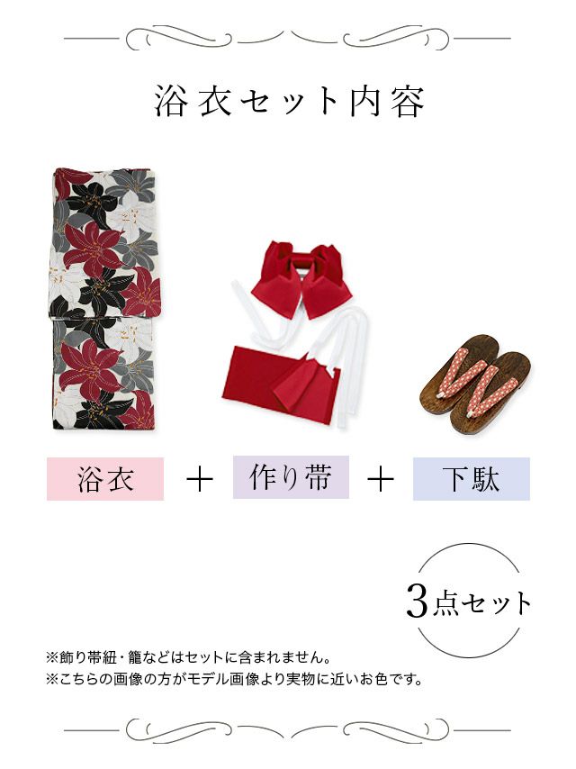 多くの浴衣は「浴衣+帯」または「浴衣+帯+下駄」の3点セットになっています。商品ごとにセット内容が異なるため、各ページの詳細をご確認ください。