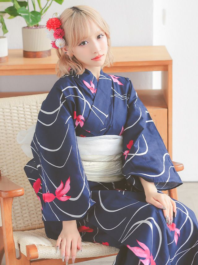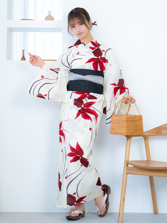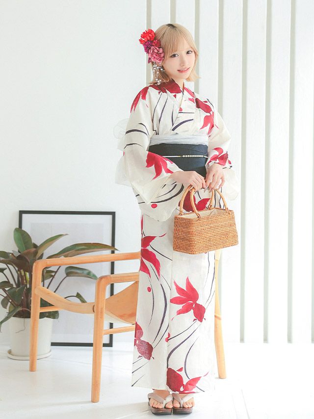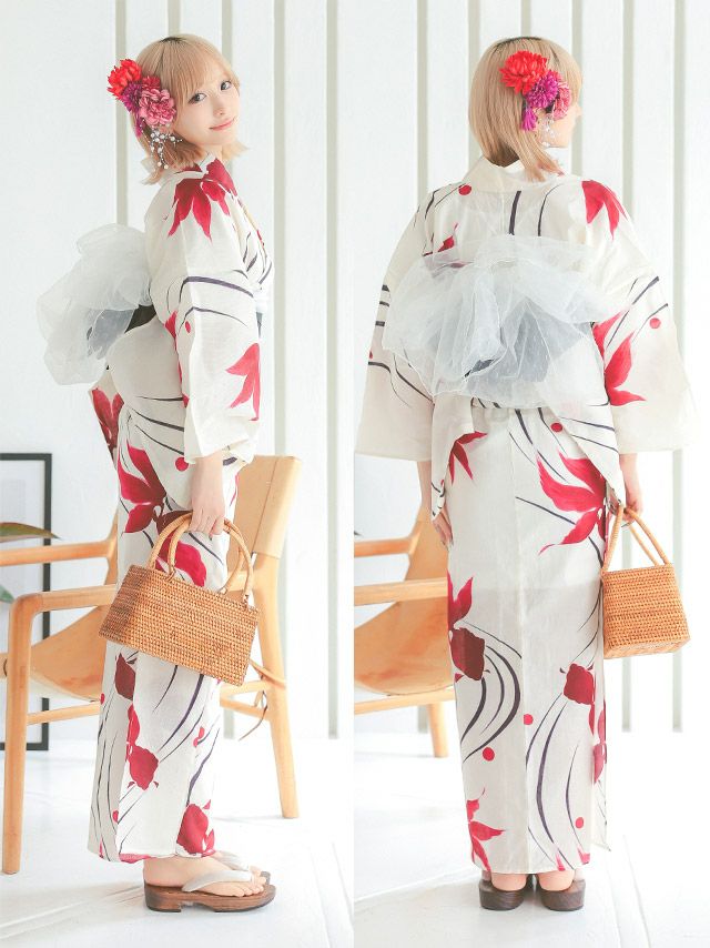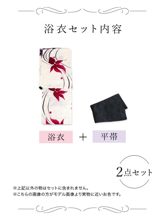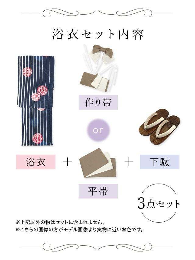 多くの浴衣は「浴衣+帯」または「浴衣+帯+下駄」の3点セットになっています。商品ごとにセット内容が異なるため、各ページの詳細をご確認ください。