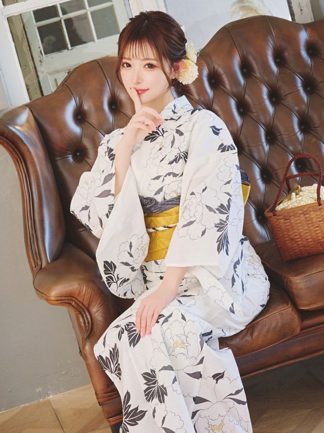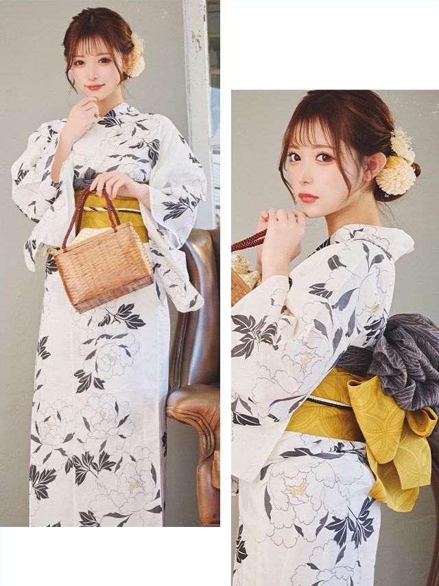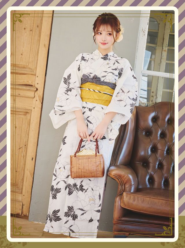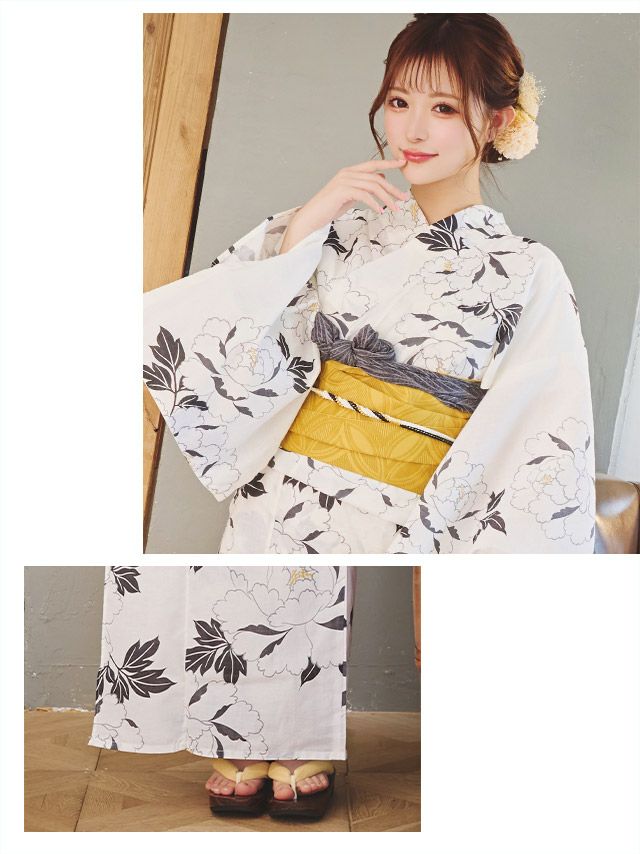 レトロ 白地×モノトーン牡丹ゆかた3点セットのイメージ画像1