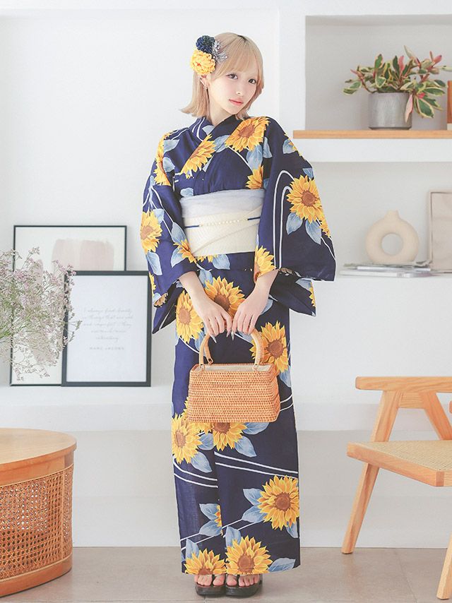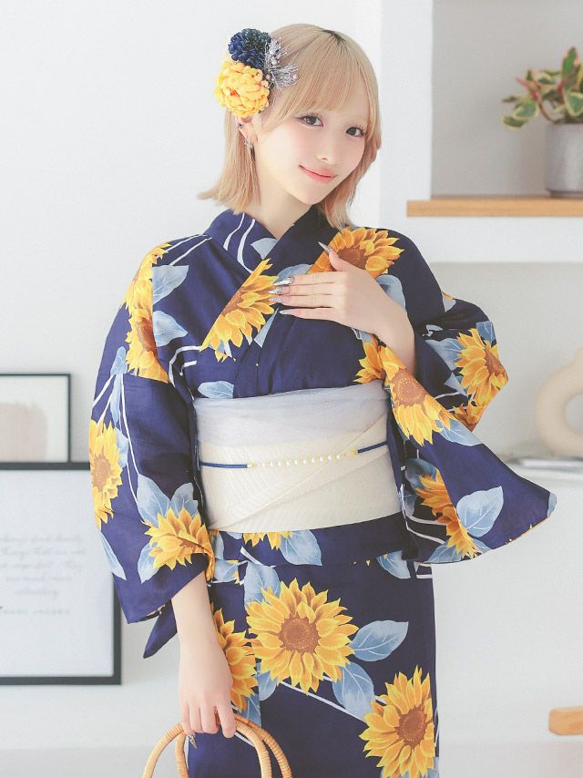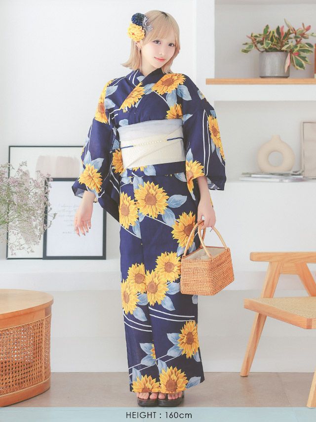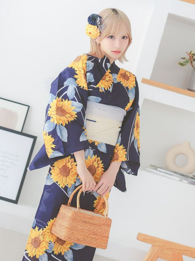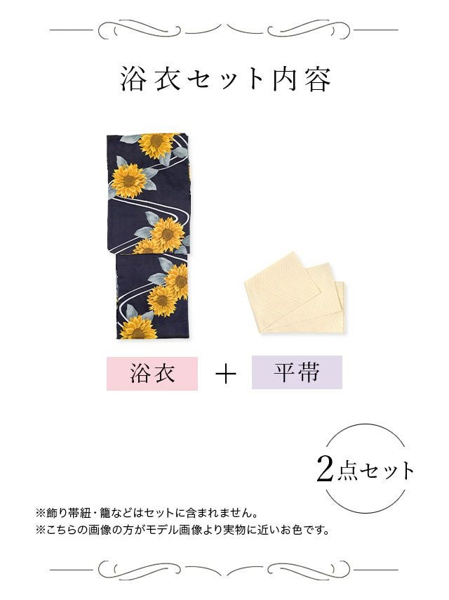明るく元気な印象に♪ [浴衣] 向日葵 紺地 流水 2025 レトロ 2点セット まやりん着用 (ゆかた・平帯)