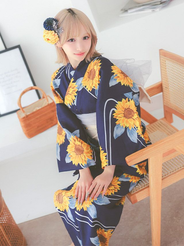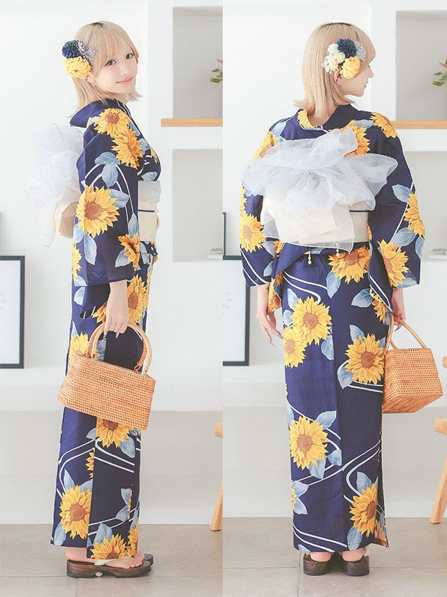4. [浴衣] 向日葵 紺地 流水 2025 レトロ 2点セット まやりん着用 (ゆかた・平帯)