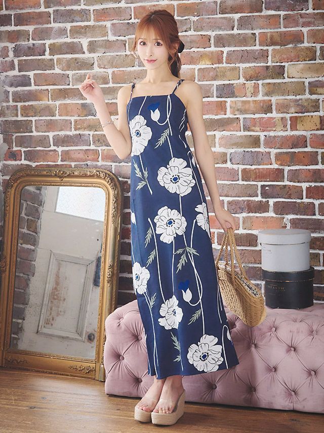 浴衣とワンピースの2Wayを楽しめる♪ [ワンピース浴衣] ネイビー線画ポピー レトロ 簡単 一人で着れる 3点セット (ゆかた羽織・ワンピース・兵児帯)