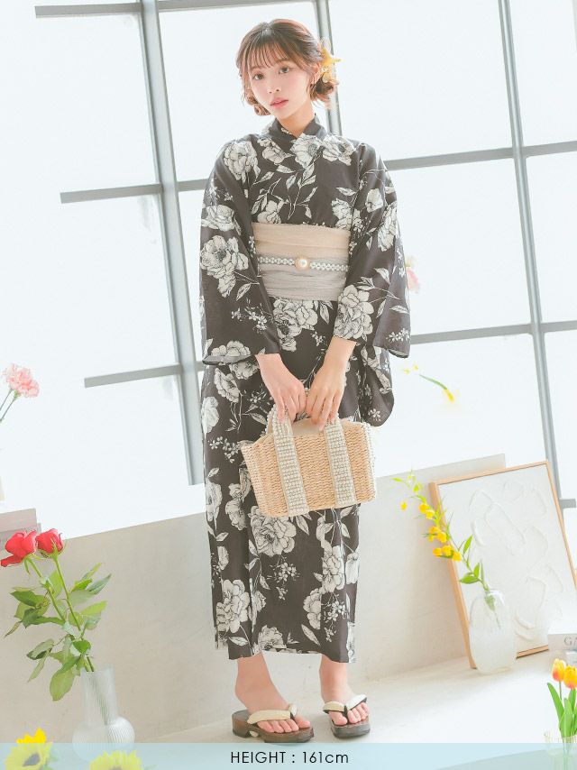 3. [ワンピース浴衣] 黒地 ヴィンテージフラワー モノトーン 簡単 一人で着れる 2025 SWEETシリーズ 3点セット 上ノ堀結愛着用 (ゆかた羽織・ワンピース・兵児帯)