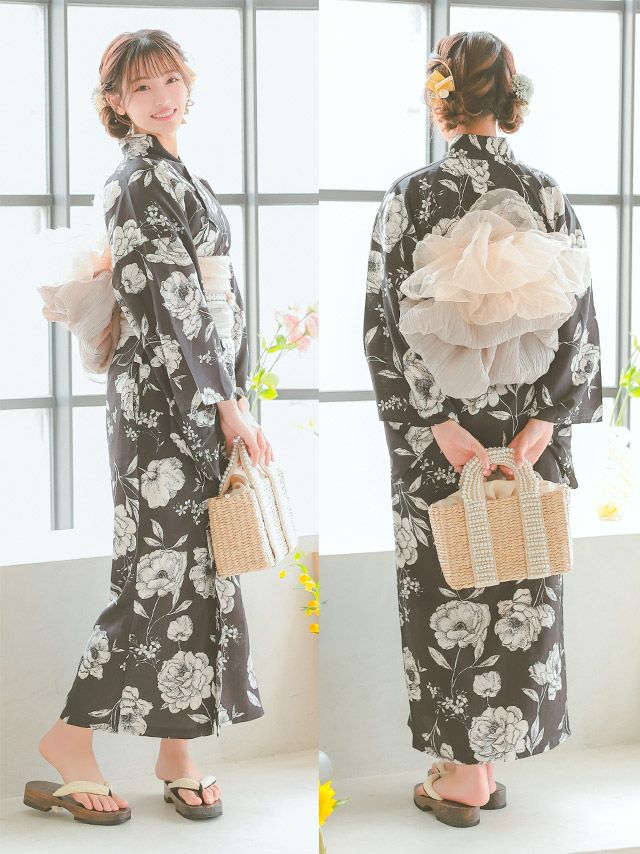 黒地 ヴィンテージフラワー モノトーン 簡単 一人で着れる 2025 SWEETシリーズ 3点セットの全身サイドバック