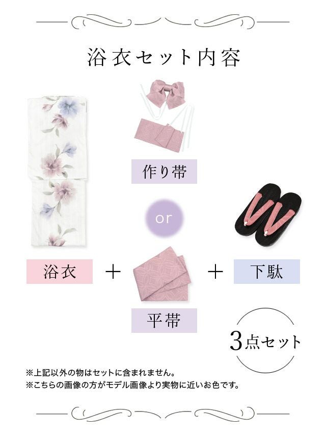 妖艶 白地×2色水彩フラワー ゆかた3点セットのセット内容