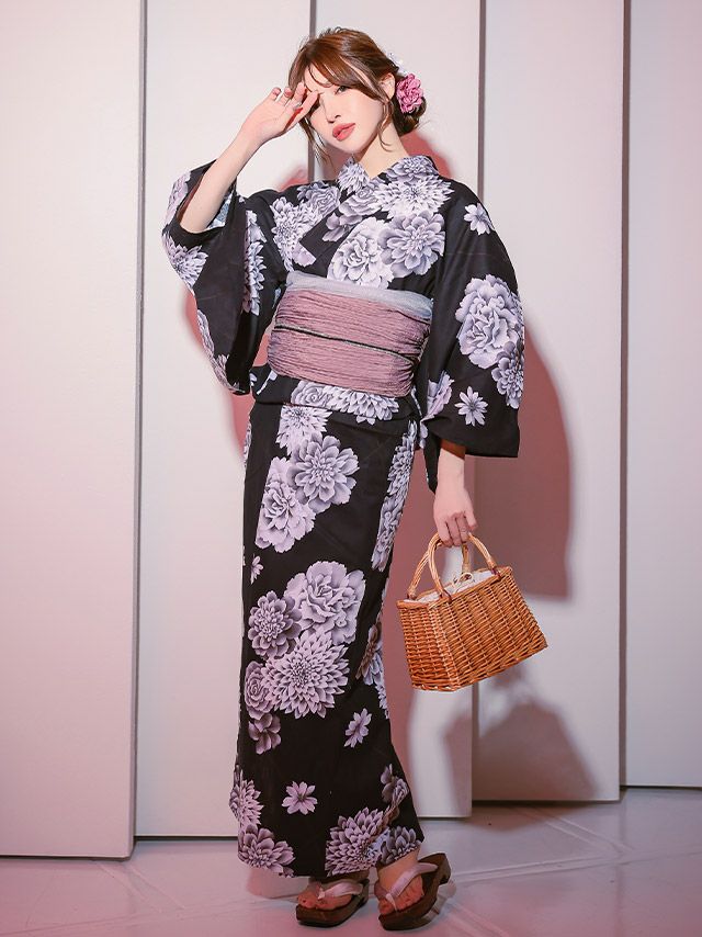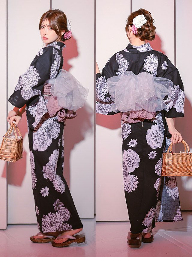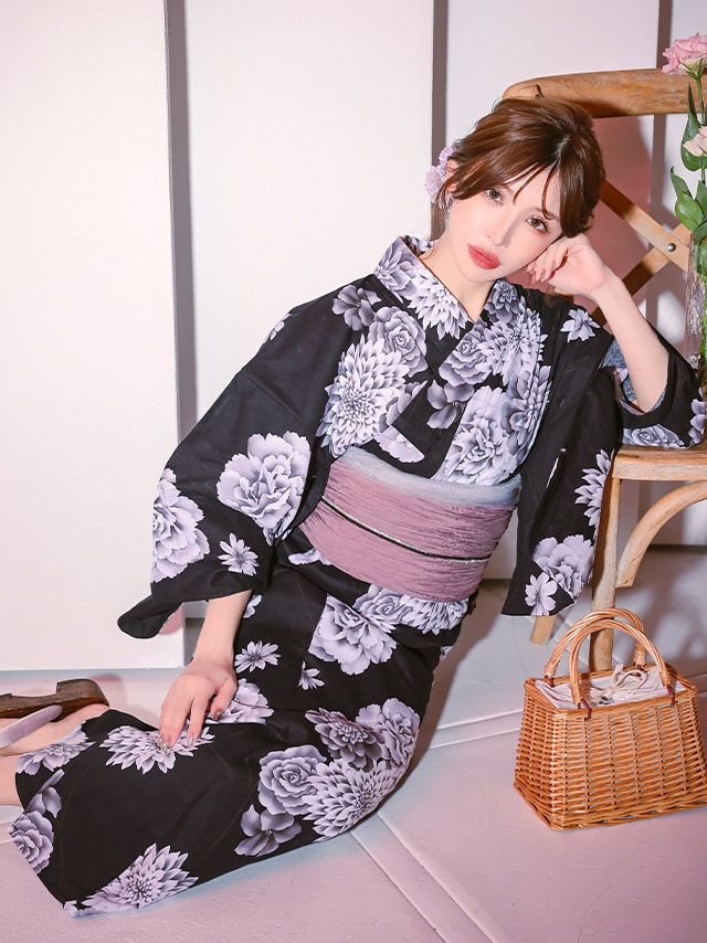 妖艶 黒地 グレー 白 花 ゆかた3点セットのセット内容