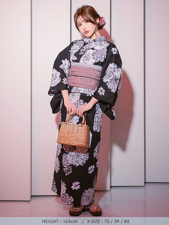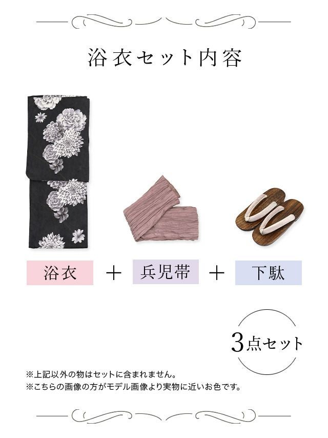 3. [浴衣] 黒地 グレー 白 花 2025 妖艶シリーズ 3点セット (ゆかた・兵児帯・下駄)